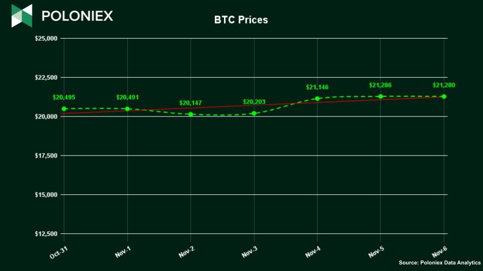 Dogecoin (DOGE) gained around 26 per cent at one point last week amid Twitter’s massive layoffs. Thanks to a tweet posted by Elon Musk, DOGE is now trading at $ 0.12 by press time. Meanwhile, Bitcoin (BTC) and Ether (ETH) are trading at $20,926 and $1,585 respectively. As for the 24H gainers on Poloniex, they are KUB/ USDT, LTCBULL/ USDT, SENSO/ USDT, XLMBEAR/ USDT, MATIC/ USDT, LTC/ USDT.