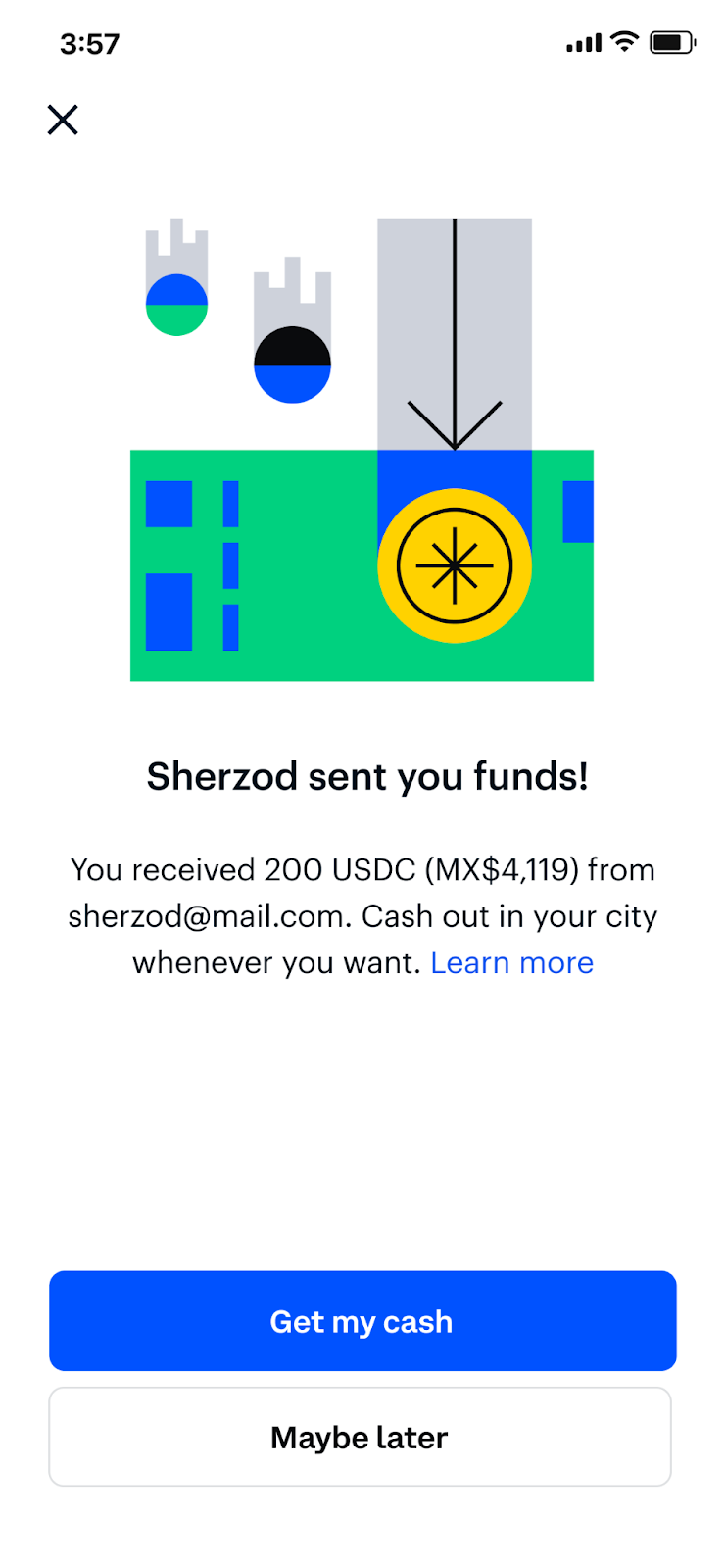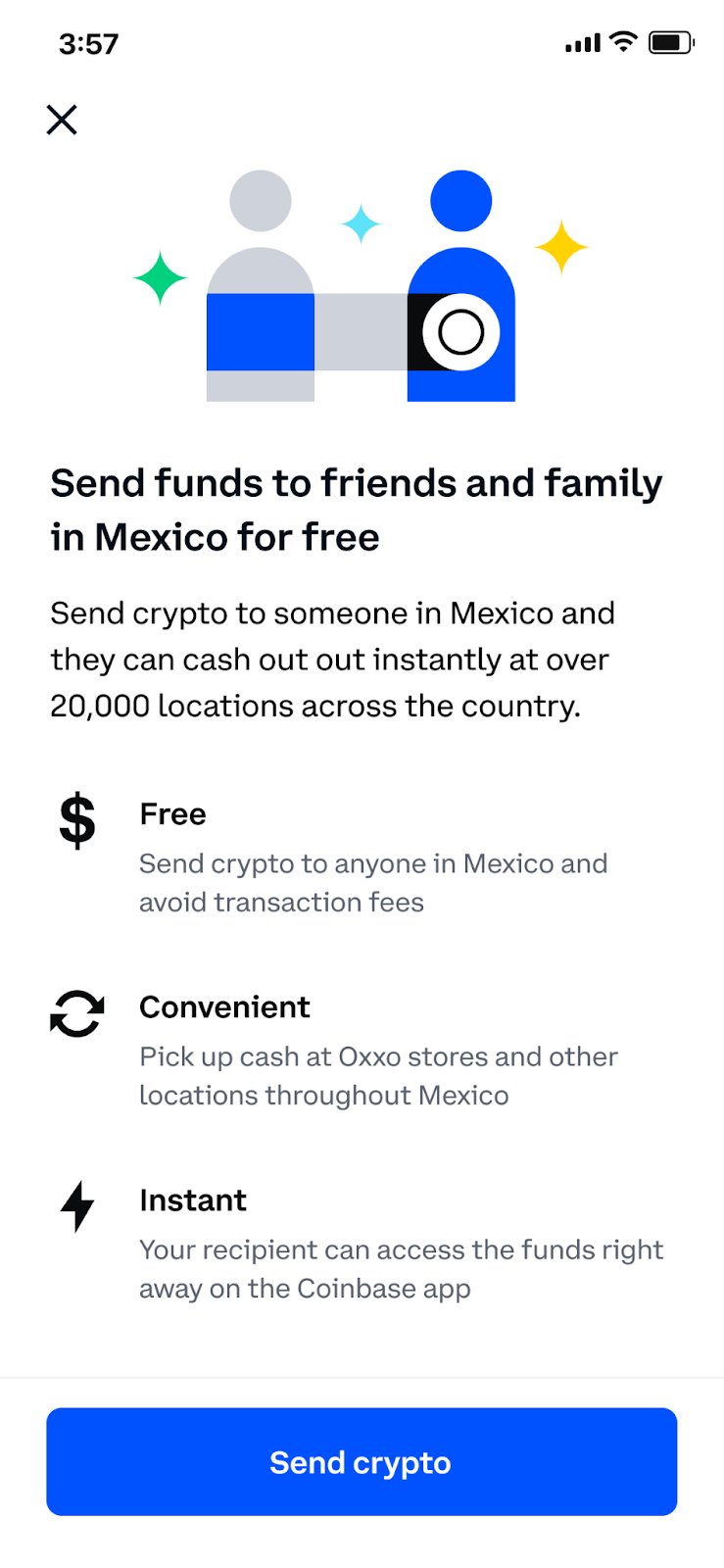 Coinbase has long presented a way to instantly send crypto (including stablecoins such as USDC) to family and friends anywhere in the world for free, and to allow recipients to invest in any of the 100+ cryptocurrencies that we support. Today, we’re introducing the ability for recipients in Mexico to cash out their crypto holdings in their local currency. The lower price of sending and cashing out crypto and flexibility in how to store funds will allow recipients to keep even more of their money.