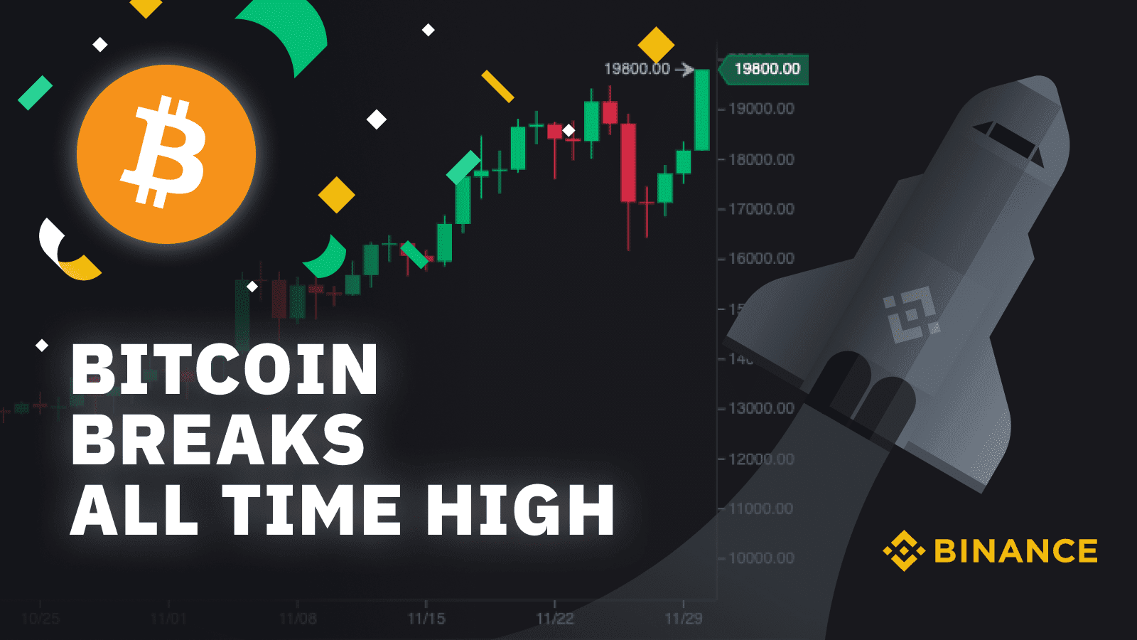 1. Bitcoin (BTC) Breaks All-Time High on Binance. Nearly three years since its previous peak, Bitcoin (BTC) has finally reached a new all-time high last Sunday, Nov 30, hitting $19,881.56 on Binance and capping a bullish month thatâs one for the record books.