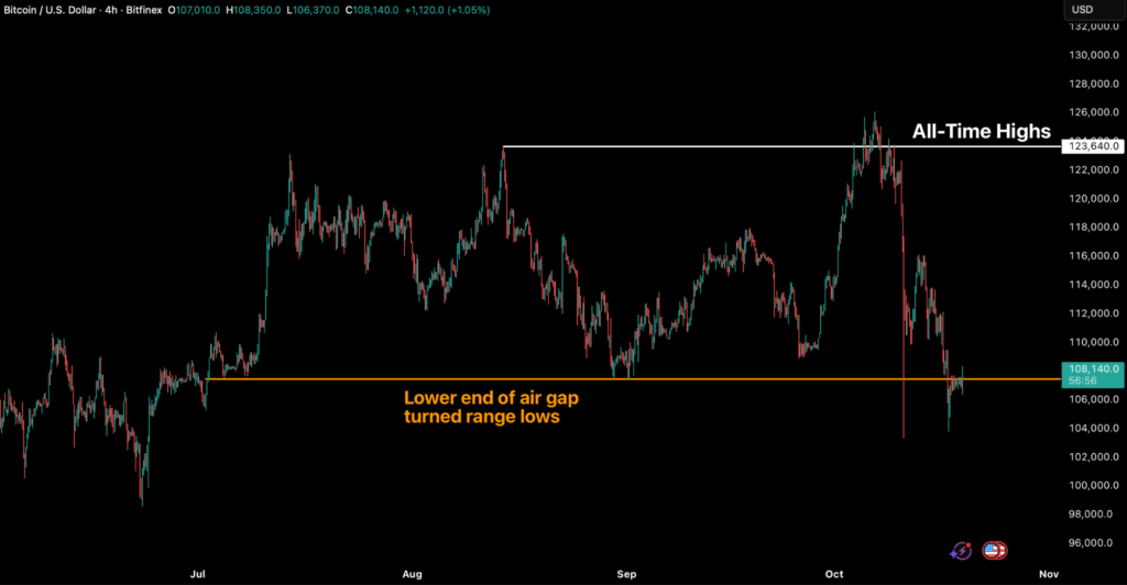 The 18.1 percent peak-to-trough drawdown we have seen this month remains consistent with prior cycle-high retests since 2023, typically marking consolidation phases rather than trend reversals. Yet, institutional demand has yet to return decisively. Bitcoin ETFs recorded over $1.22 billion in net outflows last week, mirroring equity market weakness. Long-term holders have also reduced supply by roughly 0.3 million BTC since July, signalling steady profit-taking while new inflows lag behind. For now, the $107,000–$108,000 zone remains a key inflection point. Failure to sustain above it would indicate demand-side fragility, potentially leading to further localised drawdowns before equilibrium is restored.