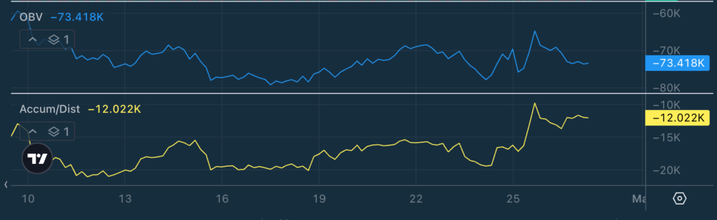 When A/D starts flattening while OBV is still falling, it can be an early sign of quiet accumulation –  the big players positioning at these levels before it shows up in price. It doesn’t mean the bottom is in, and it’s not a trade signal on its own. But something is shifting beneath the surface.