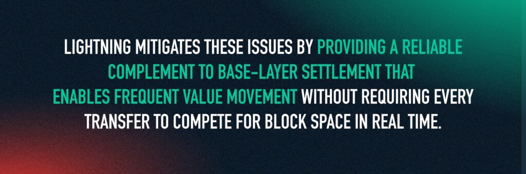 Lightning mitigates these issues by providing a reliable complement to base-layer settlement that enables frequent value movement without requiring every transfer to compete for block space in real time. For businesses managing liquidity across venues or settling customer balances, the ability to do that is invaluable.