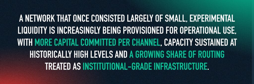 A network that once consisted largely of small, experimental liquidity is increasingly being provisioned for operational use, with more capital committed per channel, capacity sustained at historically high levels and a growing share of routing treated as institutional-grade infrastructure.
