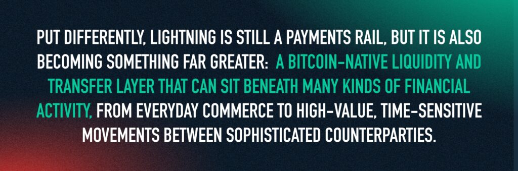 Put differently, Lightning is still a payments rail, but it is also becoming something far greater: a Bitcoin-native liquidity and transfer layer that can sit beneath many kinds of financial activity, from everyday commerce to high-value, time-sensitive movements between sophisticated counterparties.