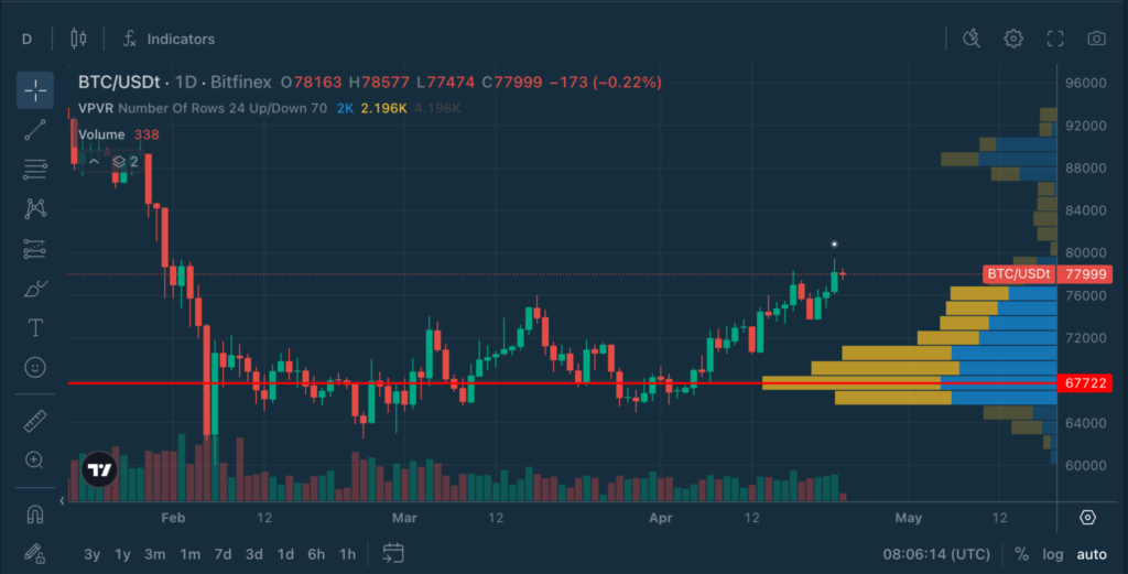 With Volume Profile Visible Range, you can zoom into the specific area of the chart you want to analyse. Let’s focus on BTC/USD on the 1-hour chart, zooming into the rally that began on April 22, 2026: