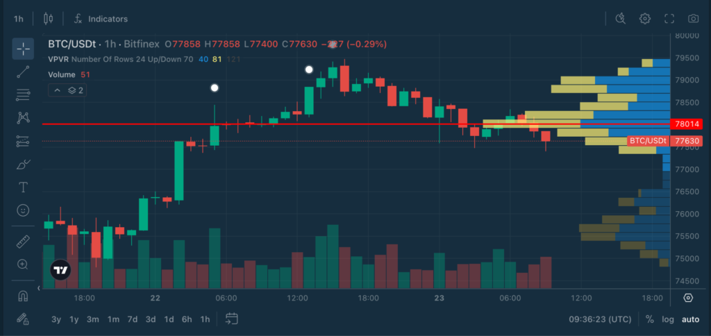 • A new high-volume node (HVN) forms around $77.8–78.2K, much closer to current price