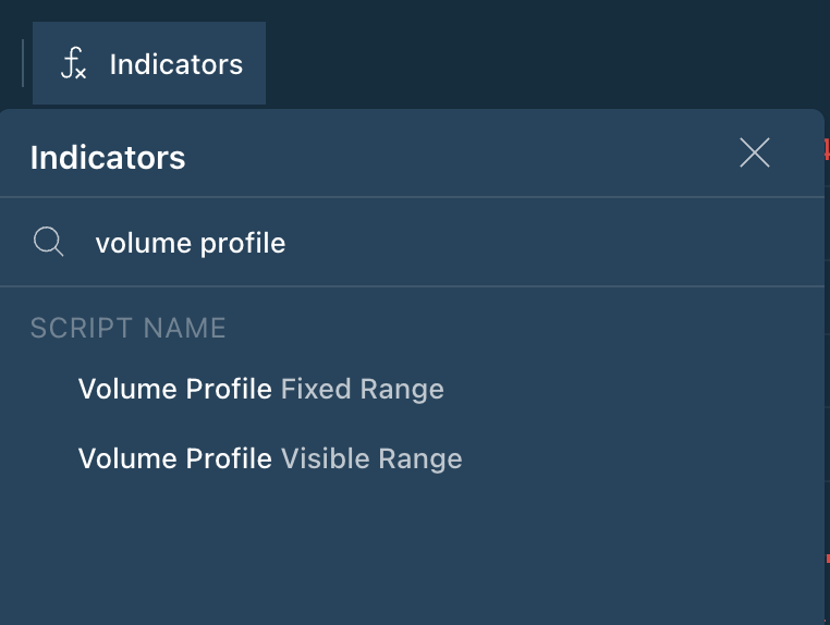 Bitfinex’s TradingView-powered charts give you direct access to the Volume Profile built into the Indicators menu. Search “volume profile” and you’ll see two profile options: Volume Profile Fixed Range and Volume Profile Visible Range.