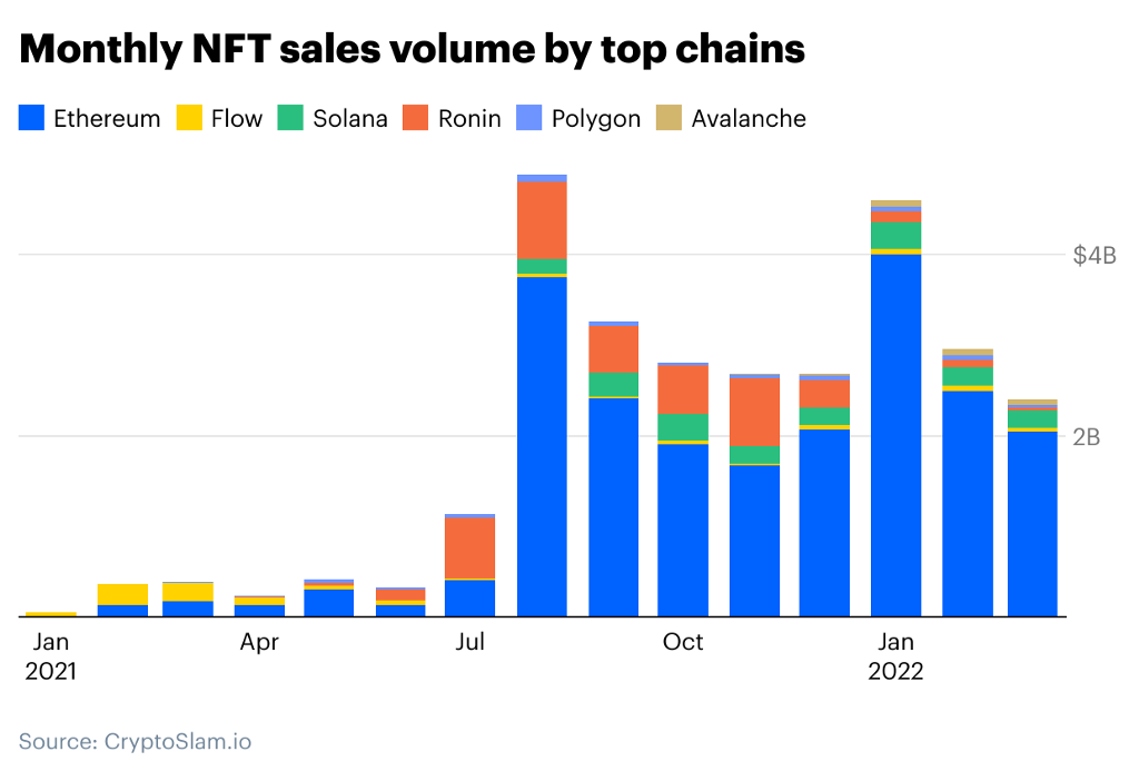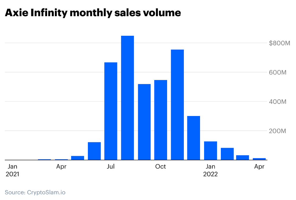Blockchain based gaming had its coming out party in 2021 centered around the rise of Axie Infinity. Sales of Axie Infinity NFTs peaked at a staggering $848M in August before falling precipitously. (Note that despite the obvious trend reversal and a major hack, Axie still posted a respectable $30M in March NFT sales).