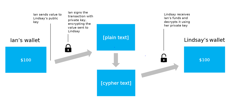 At the block level, peer-to-peer transactions are encrypted by asymmetrical cryptography, more commonly known as public-key cryptography. Public-key cryptography uses a set of public and private keys to confirm transactions are authentic and prevent them from being altered. While your public key is visible to anyone on the network, your private key is visible to only you. Here is public-key cryptography visualized in a peer-to-peer context: