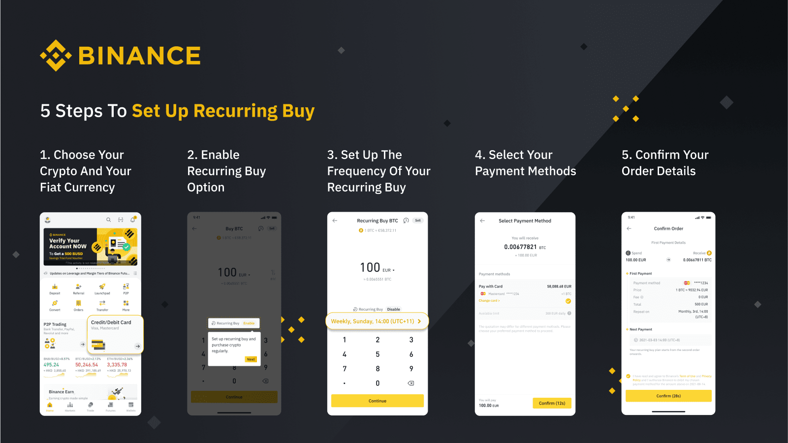 Log in to your Binance account and tap on the [Credit/Debit Card] option on the app homepage. Next, choose the crypto you would like to purchase and enable the Recurring Buy feature on the same page.