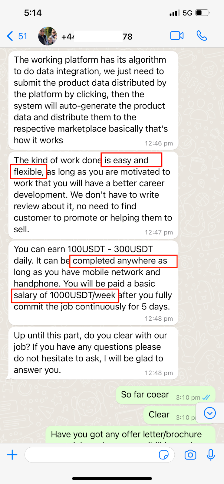 The recruiter tells Mark a digital marketing company based in London is offering part-time work with a high salary (~1000 USDT weekly) that is paid via an encrypted wallet.