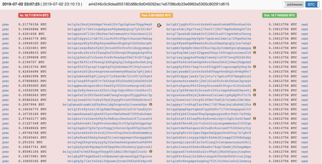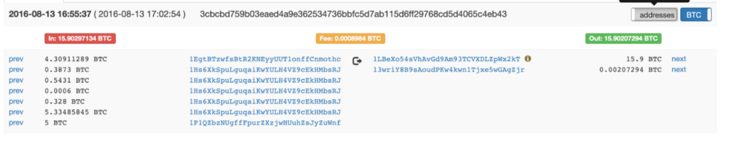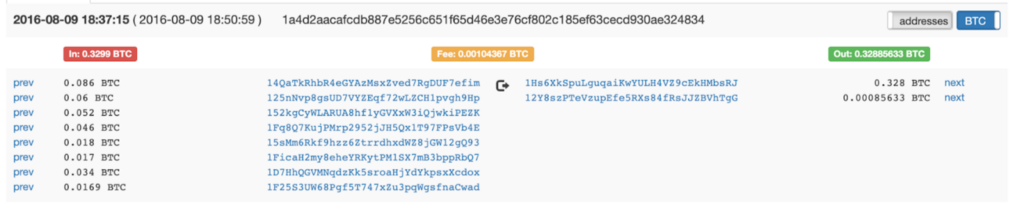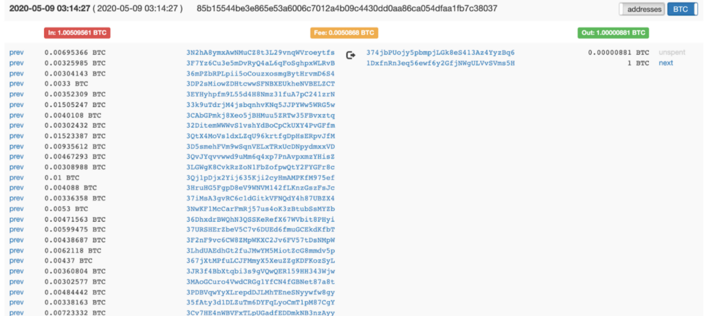 The fees also look low compared to our initial transaction. And we notice that both our output addresses’ next transactions involve the original 1Hs6XkSpuLguqaiKwYULH4VZ9cEkHMbsRJ address in their outputs. Following the address’s next transaction we arrive to output #1’s next transaction.