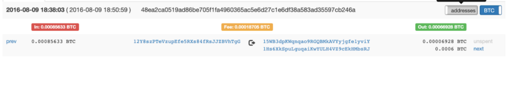 Looking at a second output address — 12Y8szPTeVzupEfe5RXs84fRsJJZBVhTgG — we see that its next transaction is distinct from the transaction it previously made: