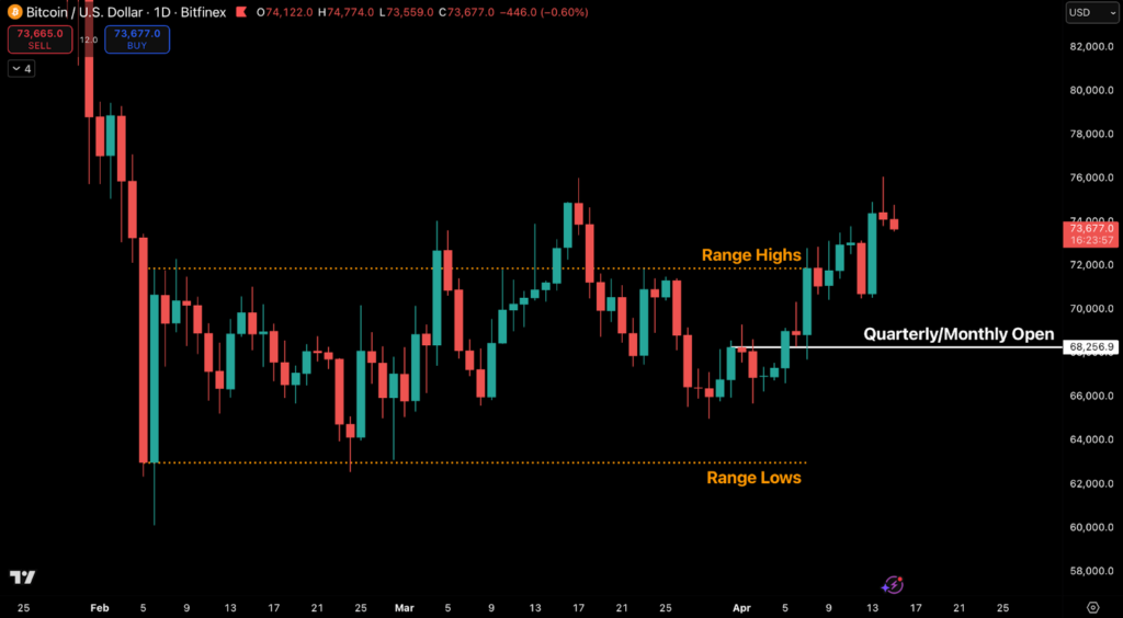 • The Point of Control (POC) migrated from $71,590 on April 7th to $75,250 on April 14th, with the latter marked by the week’s largest volume bar at 225 million.