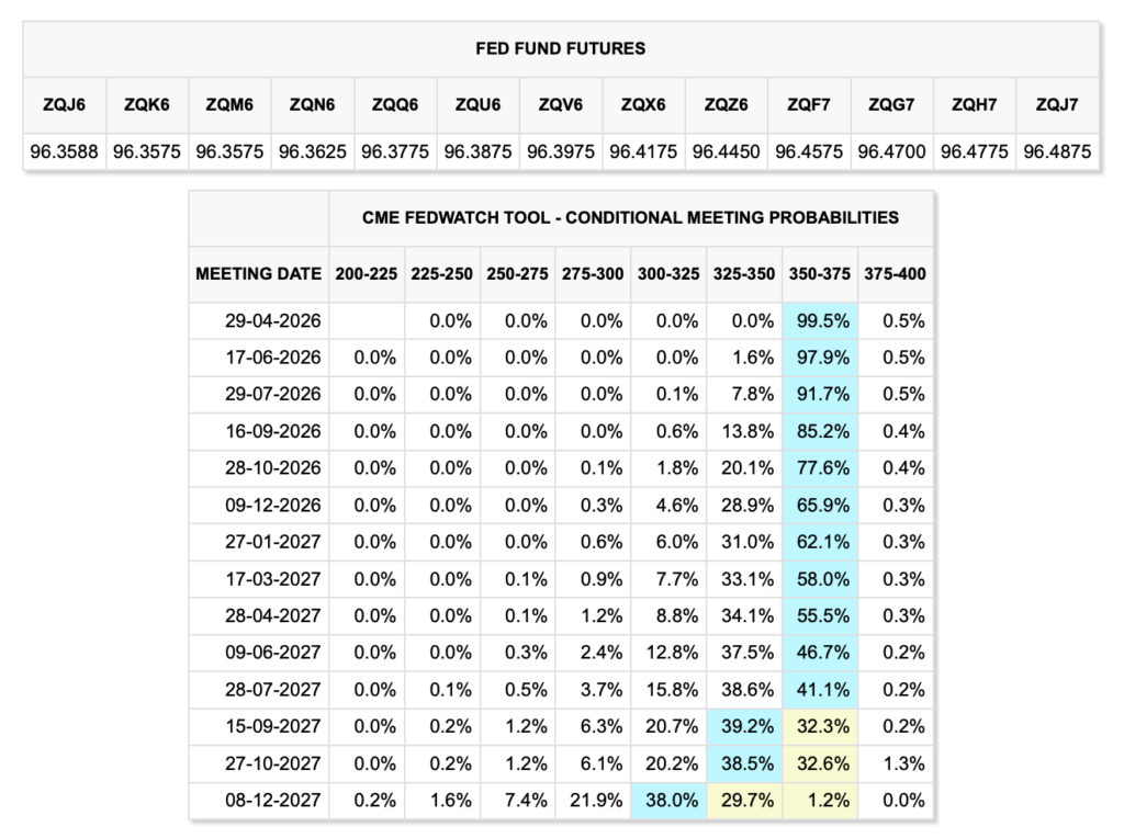 The second major macro catalyst is interest rate pricing. The April 28–29 FOMC is a non-Summary of Economic Projections (SEP) meeting, with an implied probability of 98.7 percent for maintaining the current 3.50–3.75 percent target range.
