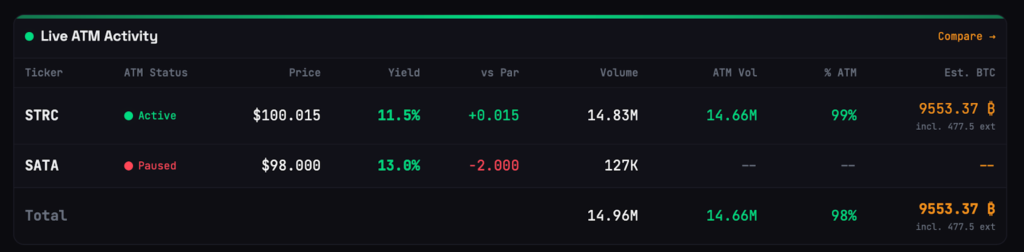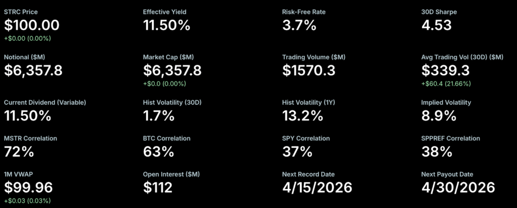 Strategy’s STRC saw a significant surge in volume, clearing $1 billion on April 13th (a new milestone) and subsequently $1.5 billion on April 14th, trading consistently at $100.005. Critically, 100% of this volume printed at or above par. This substantial activity was underpinned by the previous week’s $1 billion in funding, which facilitated the acquisition of 13,927 BTC at an approximate average price of $71,902.