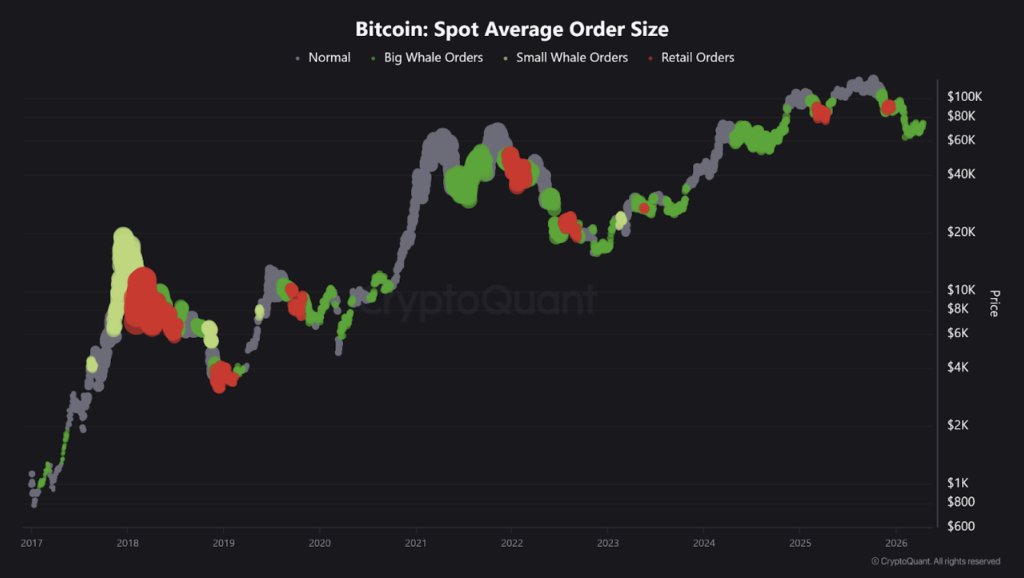 • Order-size decomposition reveals the accumulation signature is skewed toward small-whale transactions (“mid-tier accumulation signature”), echoing the structural buying visible across late 2025 and early 2026. This is structurally distinct from the 2021 blow-off top.