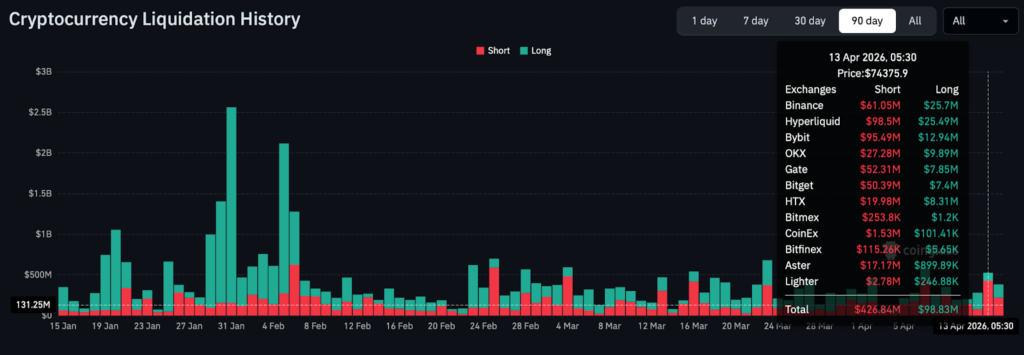 A spot-led daily close above $75,000 will confirm the durability of this leg beyond the STRC pause. Conversely, a rejection at this level would quickly capitulate the market back into the $70,000–$71,000 range.