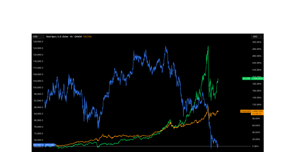 Source: OANDA / TradingView. Gold Spot/USD (XAUUSD) vs Silver vs BTC, 4h, 2025–2026