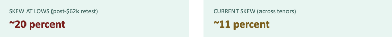 Following the retest of the $62,000 region, skew held near 20 percent. It has since eased to roughly 11 percent across tenors, marking a sharp nine-point moderation over recent sessions.