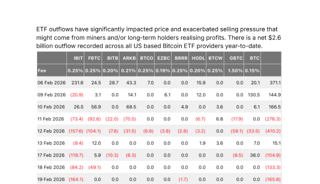 ETF outflows have significantly impacted price and added to  selling pressure that might come from miners and/or long-term holders realising profits. A net $2.6 billion outflow has been recorded across all US-based bitcoin ETF providers year-to-date.