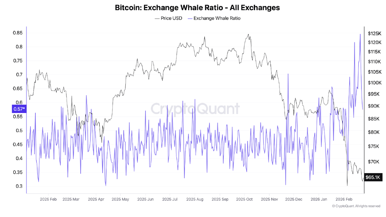 Source: CryptoQuant. Bitcoin Exchange Whale Ratio, All Exchanges. February 2025 – February 2026