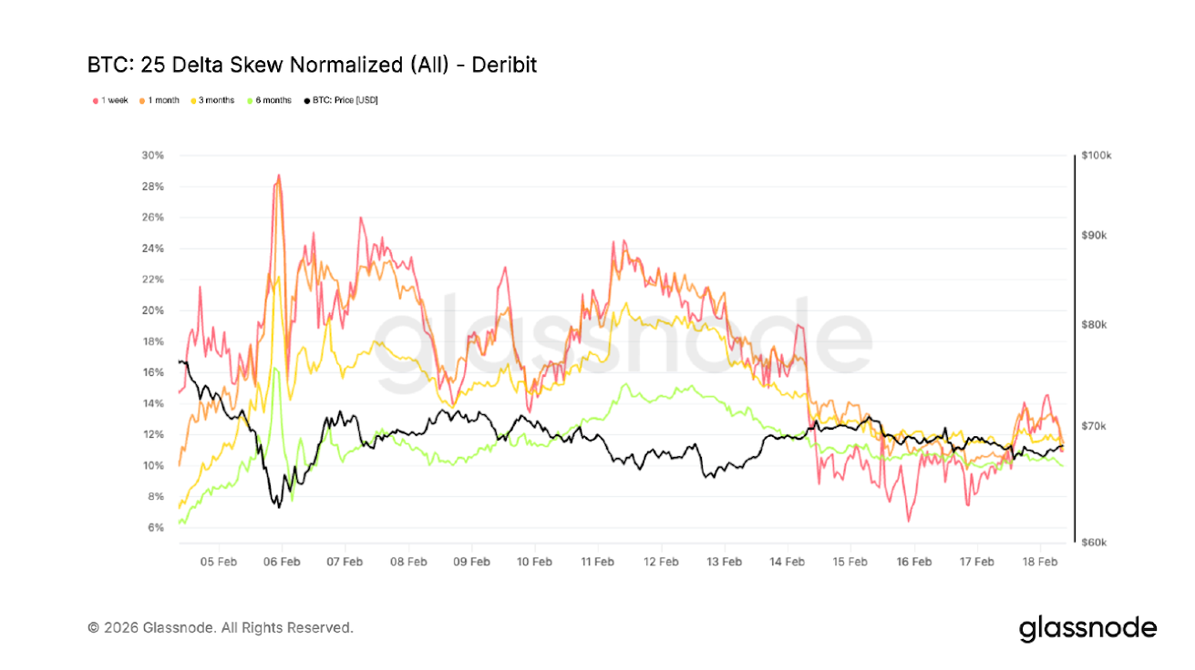 Source: Glassnode. BTC 25 Delta Skew Normalised (All) via Deribit, 05 February – 18 February, 2026