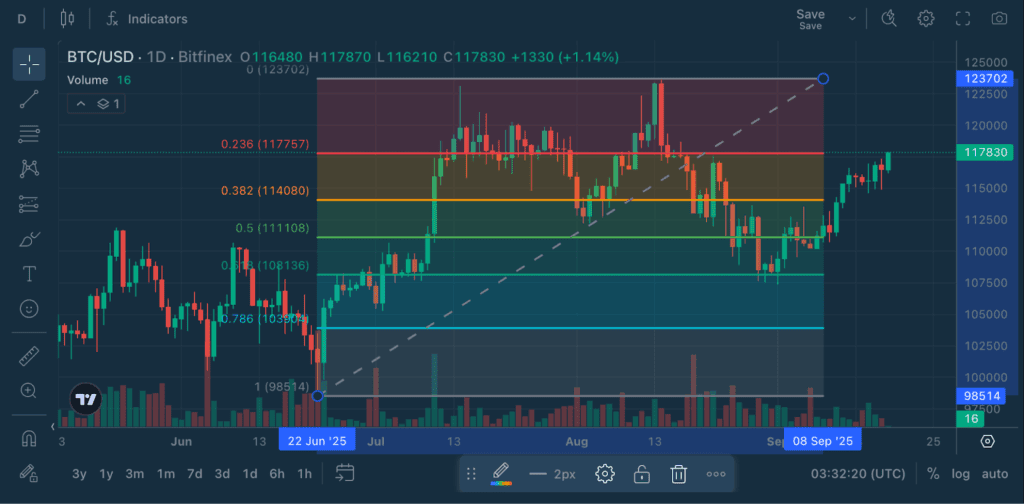 BTC rallied from this mathematical support level back above $117,000, demonstrating how the 61.8% retracement often marks important turning points. The current RSI reading of 62.20 shows healthy momentum has returned after the recovery.