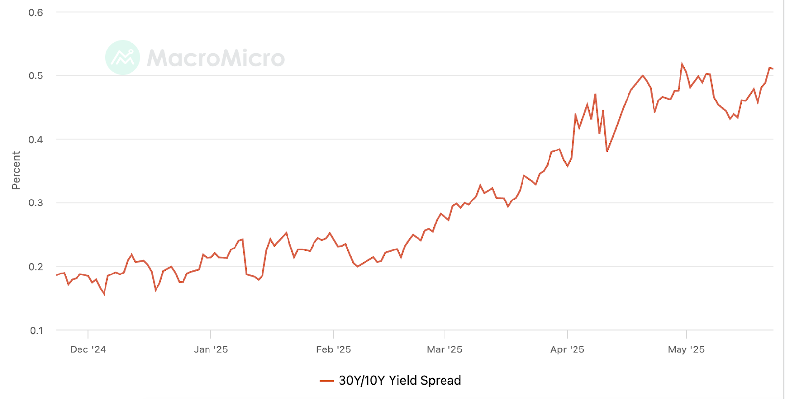 The steepening 30Y/10Y yield curve, typically a growth signal, now reflects fears over long-term risk—not optimism. With foreign demand weakening and Fed support of the bond market fading, markets are pricing in a new era of higher rates and volatility. The bond market is no longer reacting to headlines—it’s warning of a structural shift in how risk is priced.