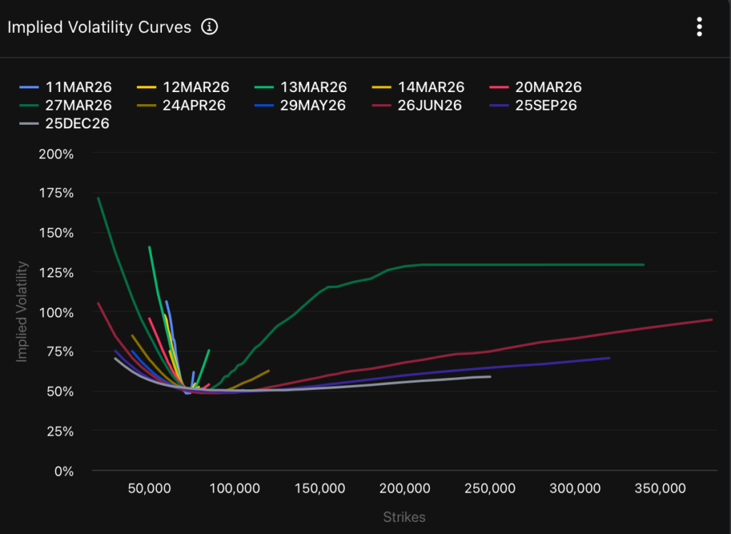 At-the-money (ATM) implied volatility for bitcoin options is currently elevated but not extreme, sitting near 47 percent across most near- to mid-term maturities. This is significantly lower than the 100 percent readings seen during the 2022 bear market, or even the 75–95 percent spikes witnessed in early February.